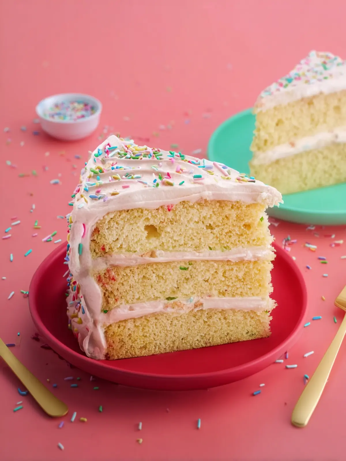 - To frost, place one cake onto a cake stand or plate. Add 1/3 of the frosting to the top of the cake. Spread to the edges. Top with the second layer and the remaining frosting, then spread over the top and the sides. Add sprinkles if desired.