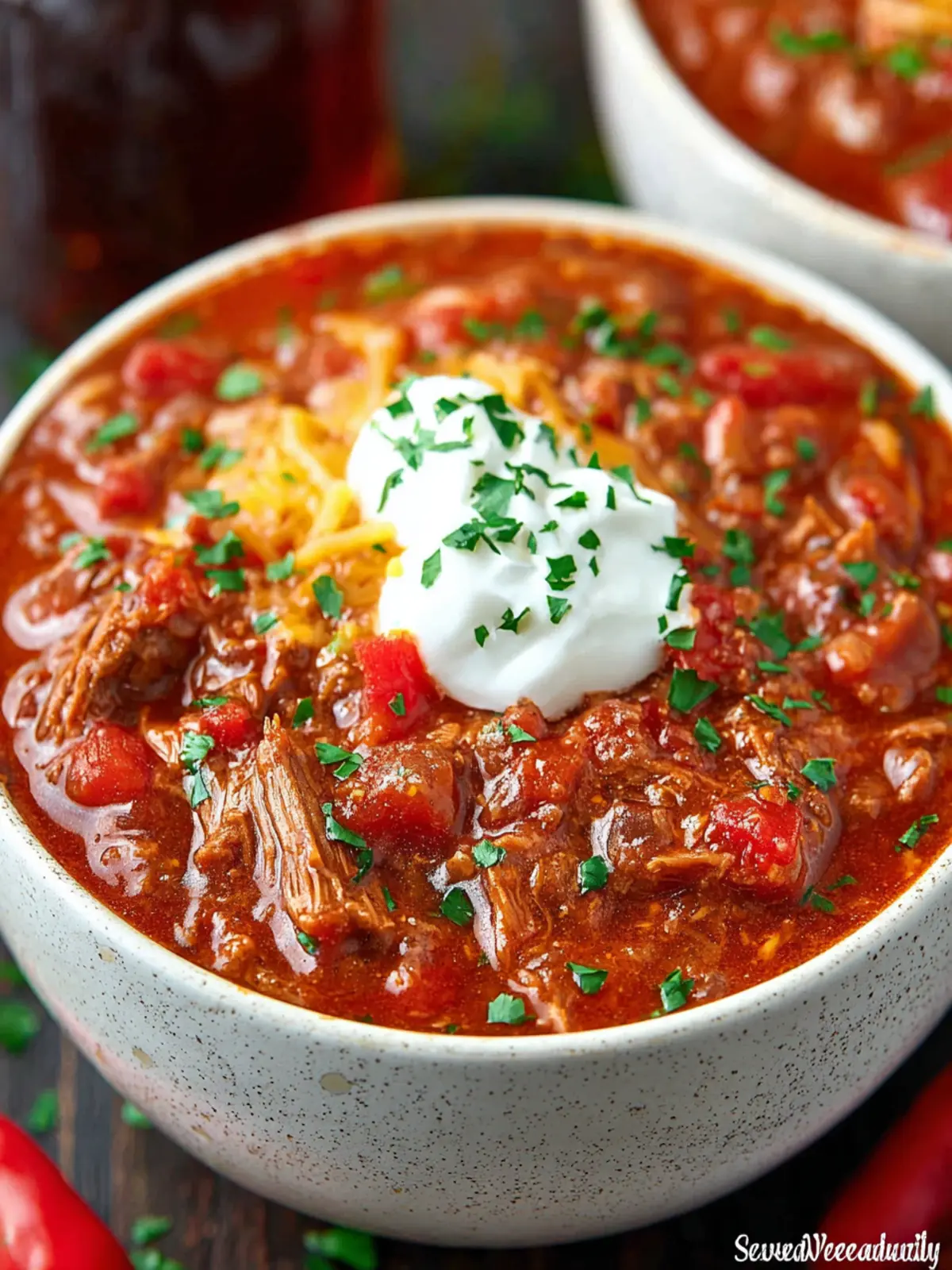 7. Serve with just a bit of parsley, sour cream, and diced red chili peppers on top.