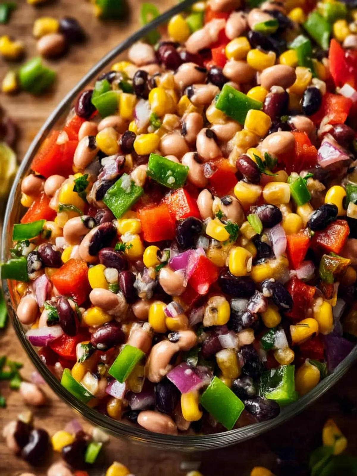 - In a large mixing bowl, combine the black-eyed peas, corn, red and green bell peppers, red onion, and jalapeño. Toss the ingredients gently to ensure an even distribution of colors and flavors.