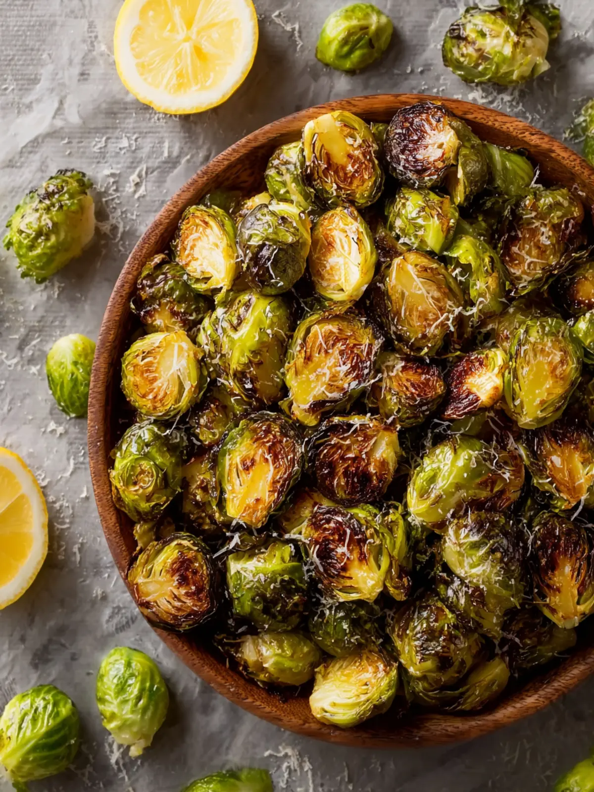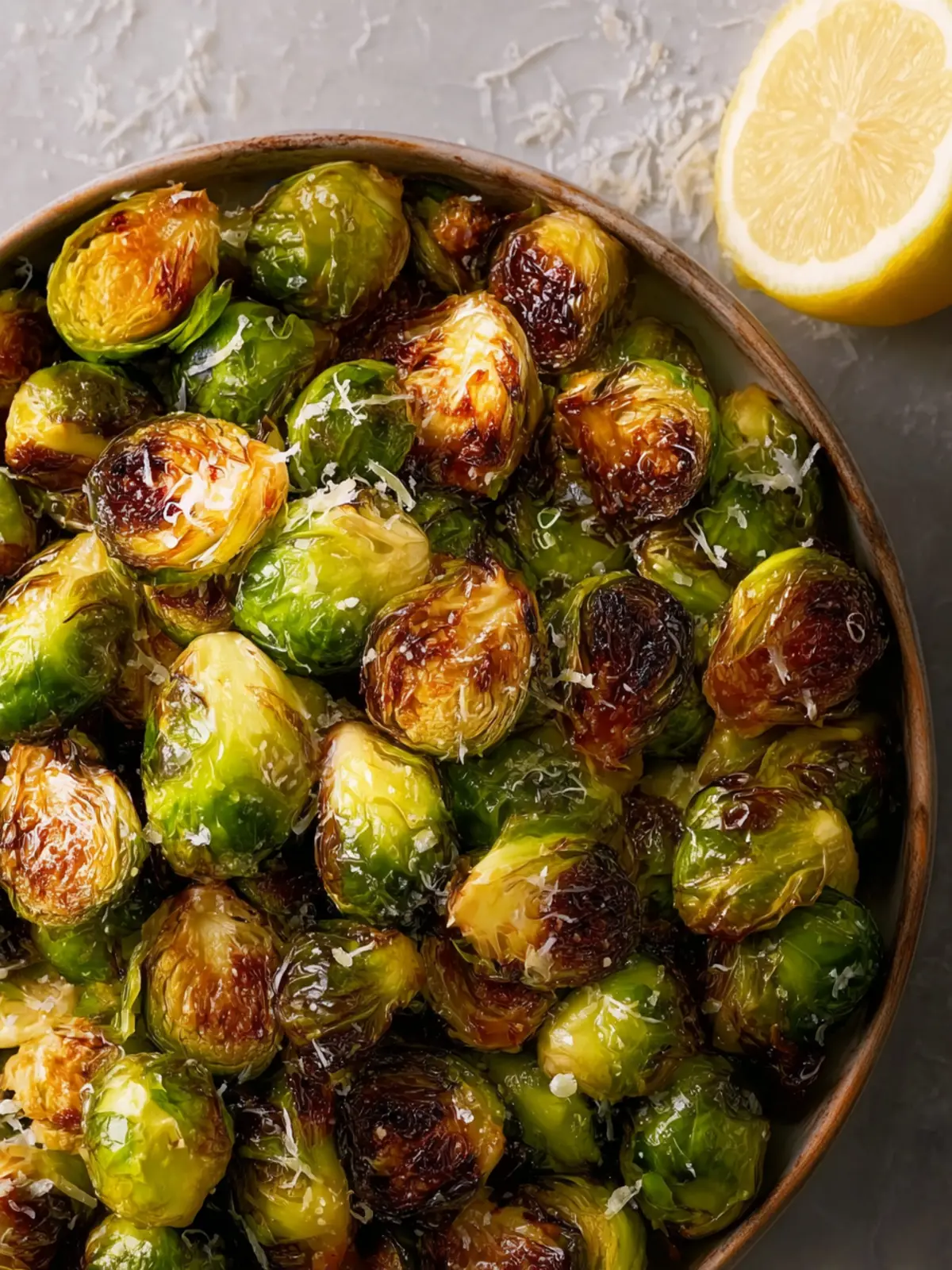 Delicious roasted Brussels sprouts tossed with olive oil, lemon, and Parmesan cheese.