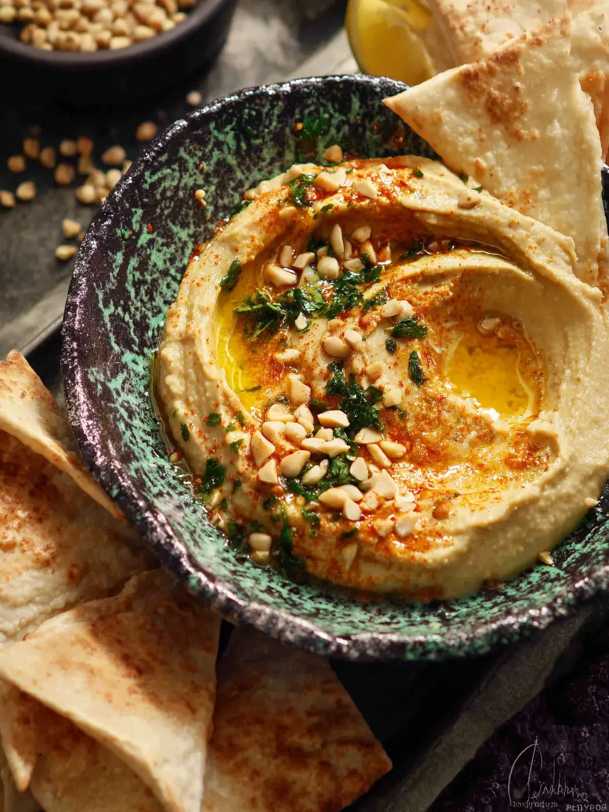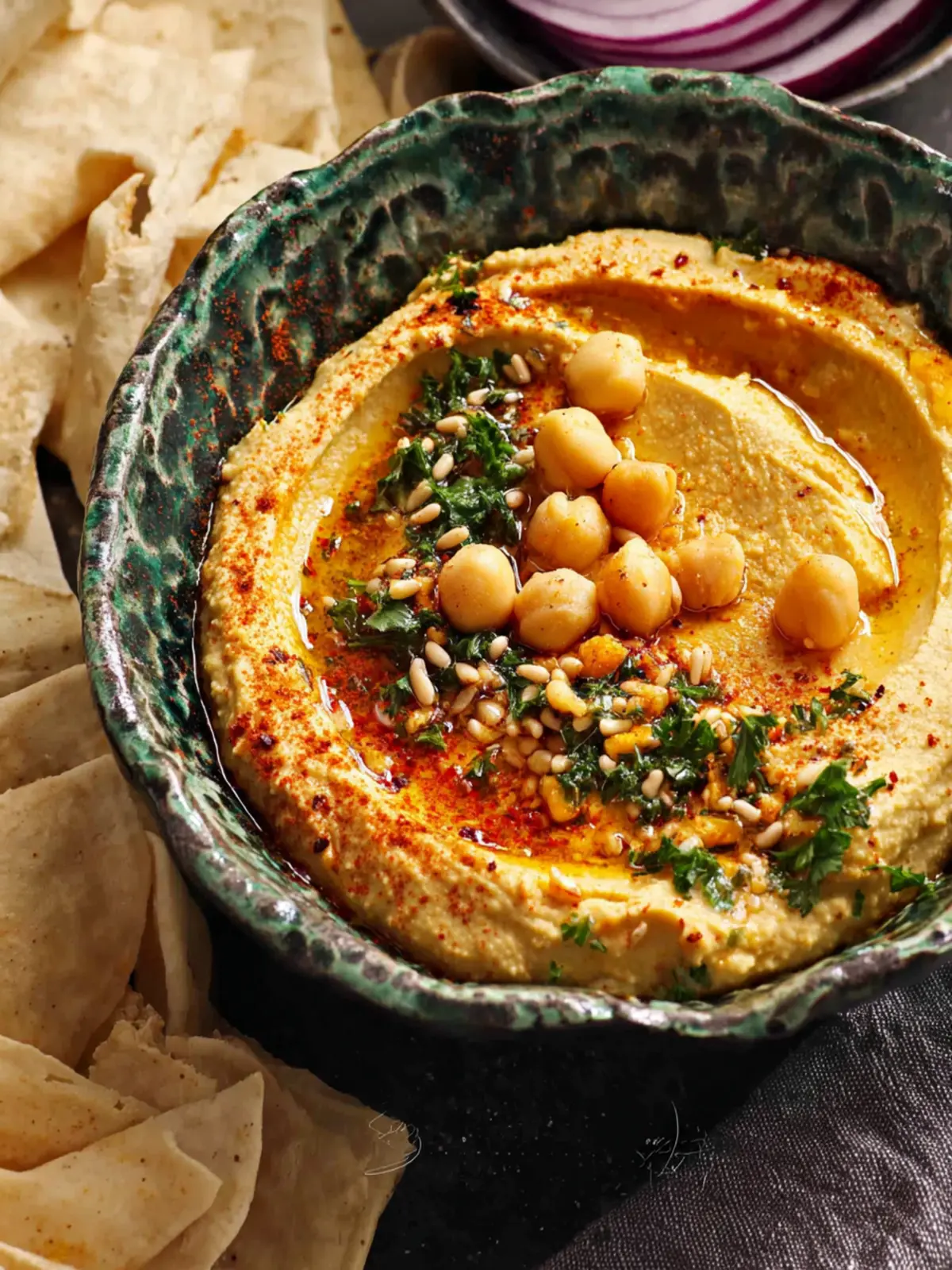 A creamy and delicious hummus made with chickpeas, olive oil, tahini, and garlic, perfect for dipping or spreading.