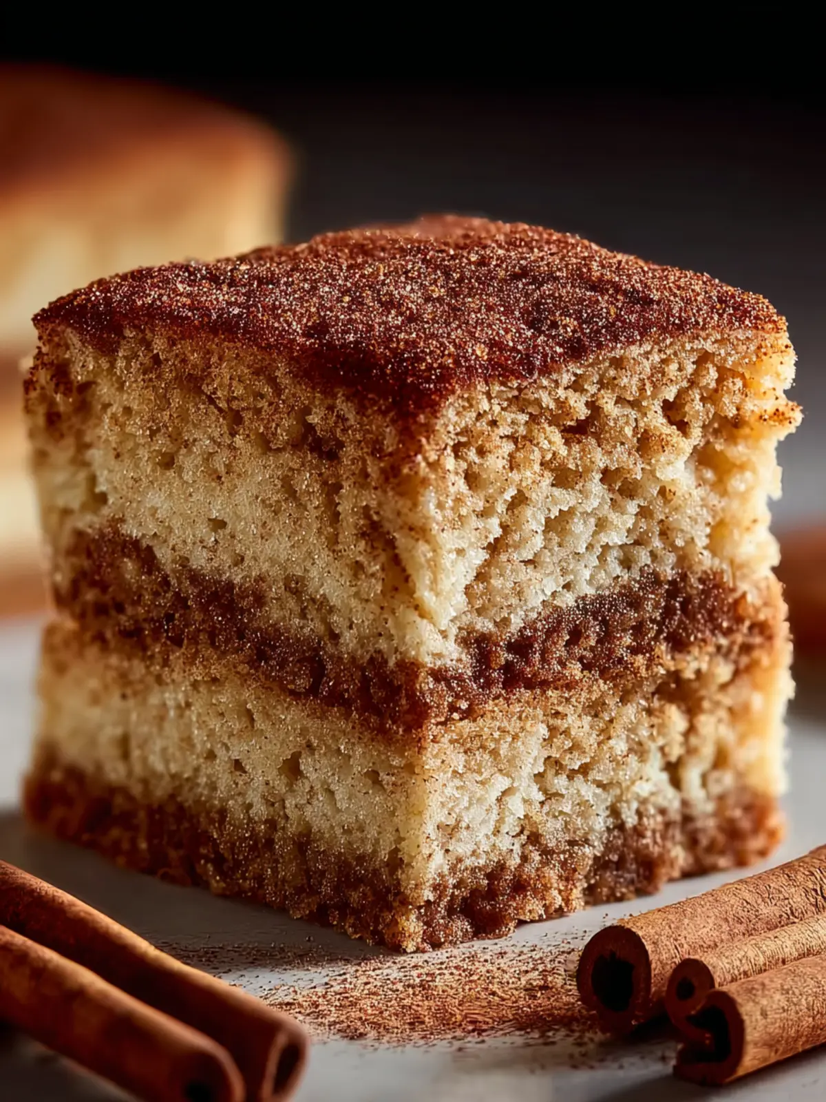When you take a bite, you’ll notice that the cake is incredibly moist and fluffy, providing a perfect base for the signature cinnamon-sugar topping. The balance of sweetness from the sugar and warmth from the cinnamon elevates this cake, making it suitable for any occasion, from casual weeknight dinners to festive celebrations.