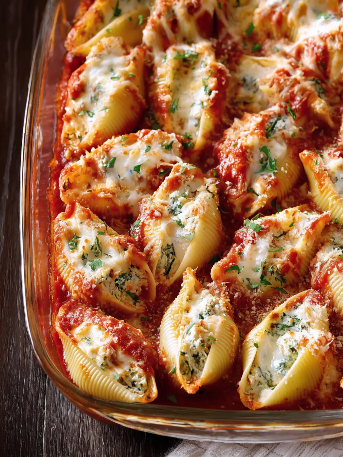 Delicious stuffed jumbo pasta shells filled with ricotta, spinach, and topped with marinara sauce.